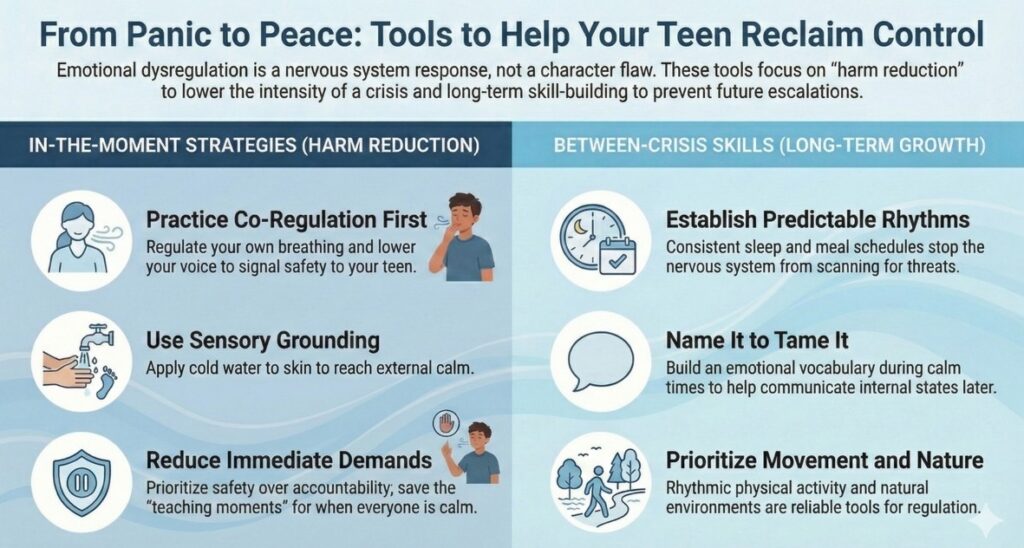 At the moment, prioritize safety and regulation over reason. Lower your own voice and body tension first; your teen’s nervous system is looking for external calm. Use sensory grounding techniques like cold water on the wrists or barefoot floor contact. Reduce demands until the storm passes, then have the accountability conversation later when everyone is calm. These tools reduce intensity; they don’t replace clinical treatment.